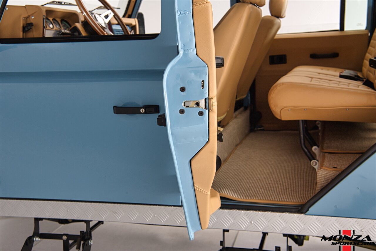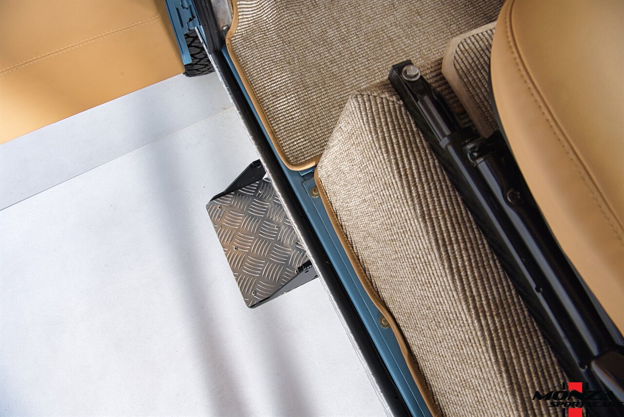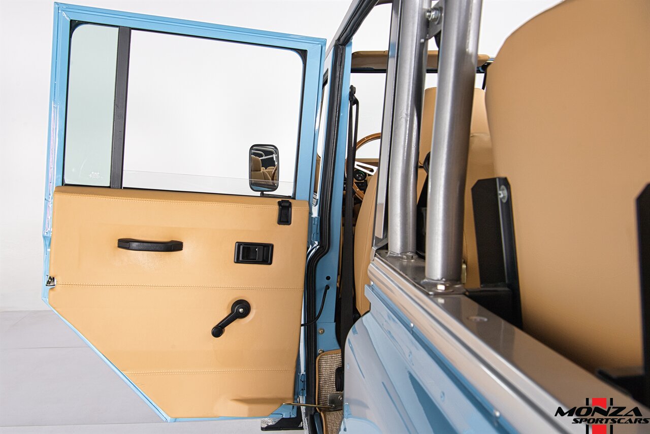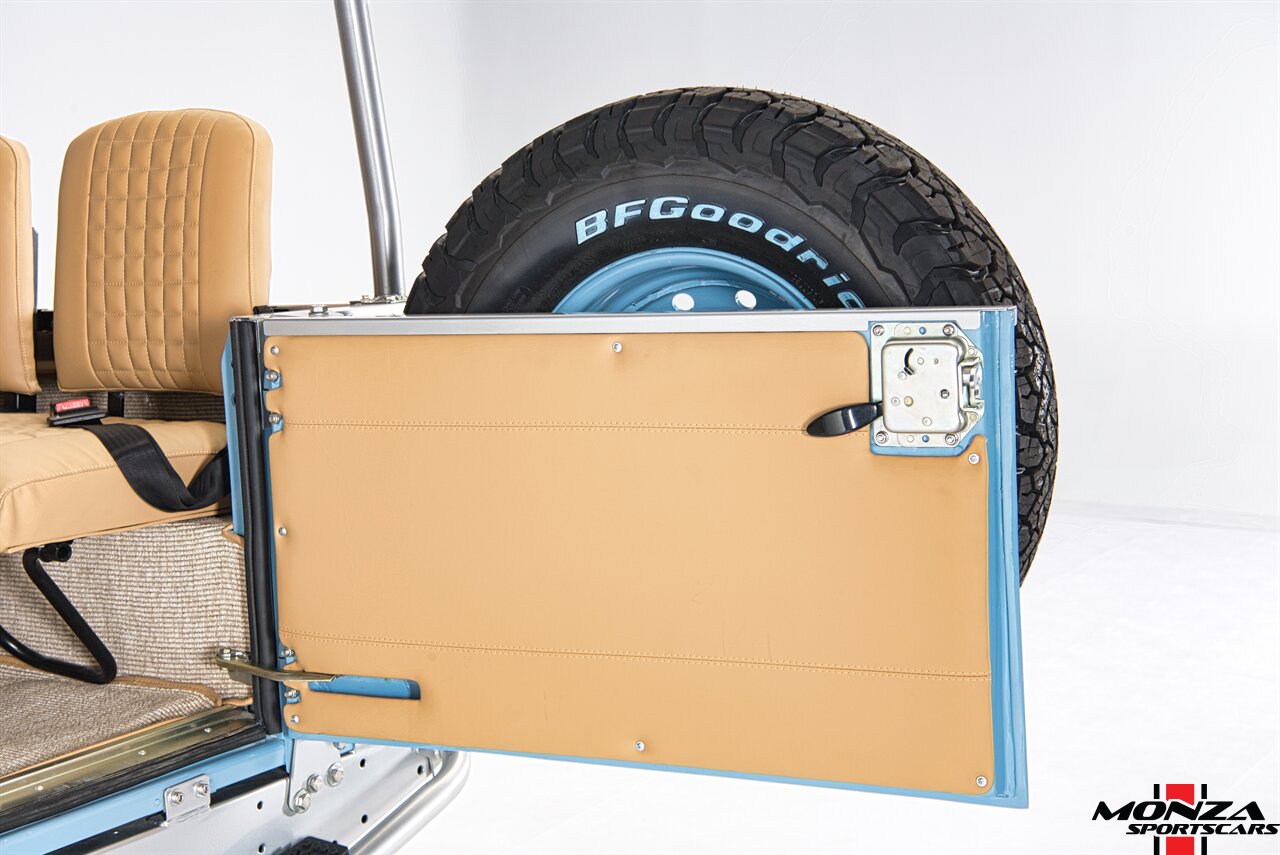 The truck was disassembled and repainted in green during its refurbishment, and it has a removable beige soft top with roll-up sides as well as body-color headlight surrounds, side mirrors, and wheel arch flares. Additional exterior features include LED lighting, a NAS-style rear bumper, fold-down side steps, and rear mud flaps.
