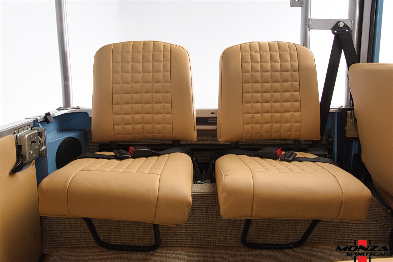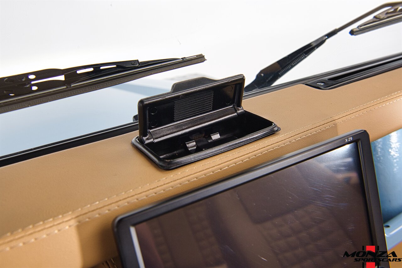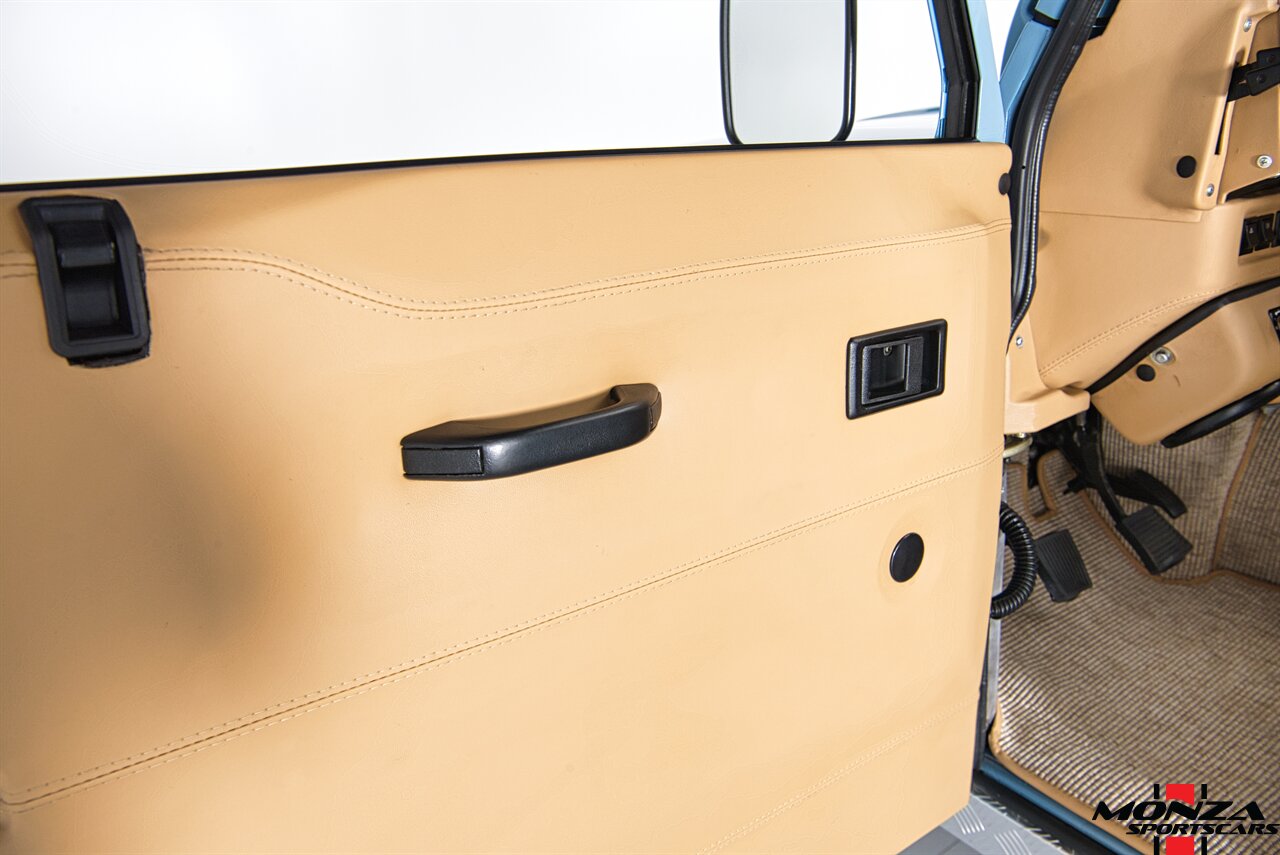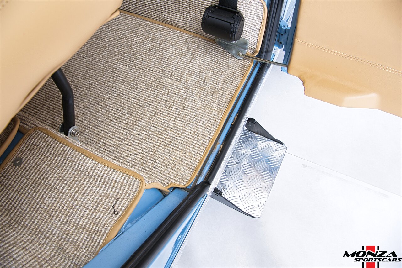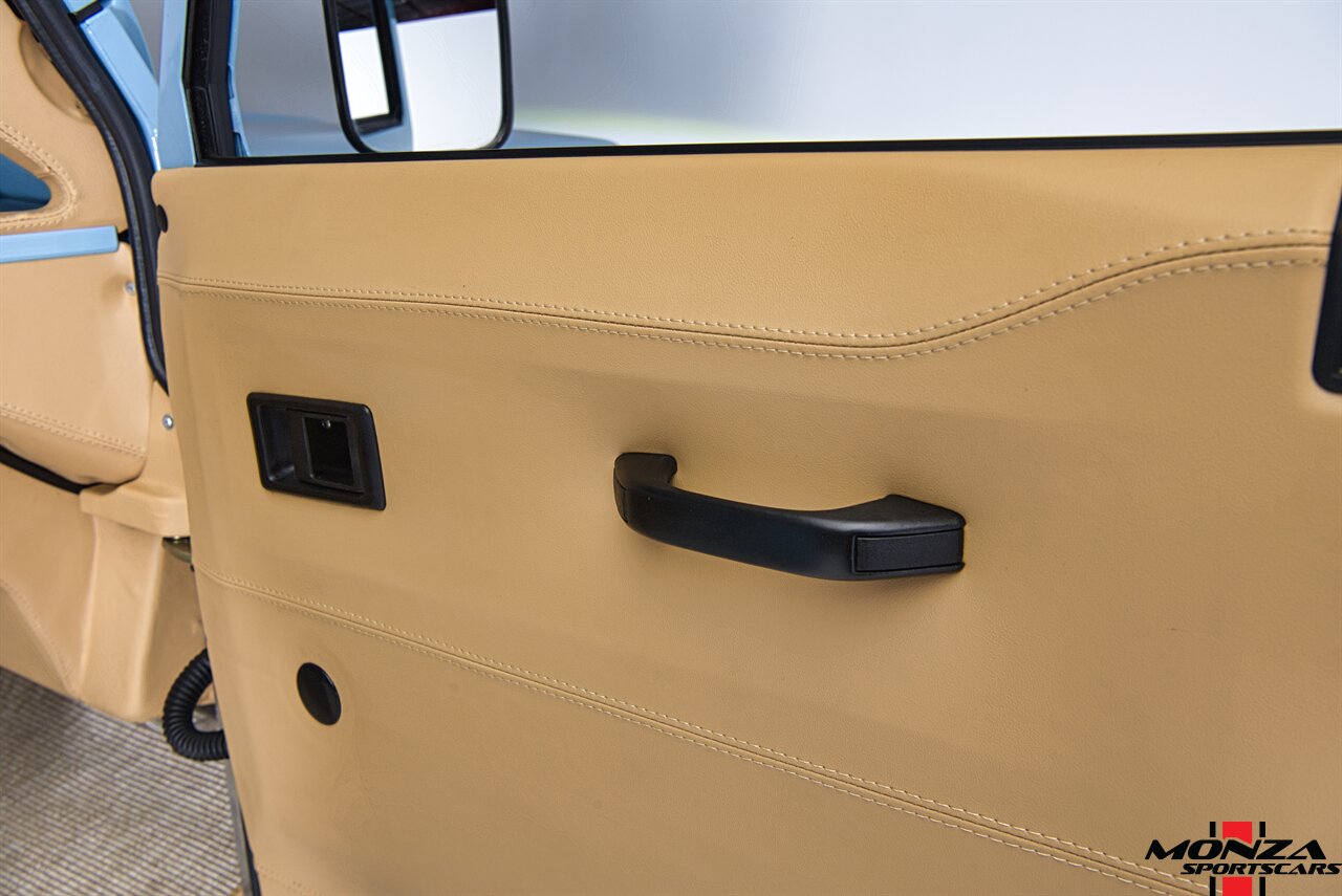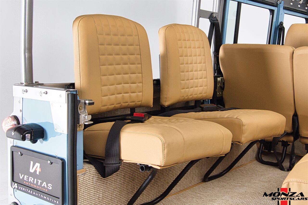 The cabin was overhauled during the refurbishment, and it houses front bucket seats and inward-facing jump seats trimmed in beige upholstery that extends to the dash, center console, and door panels. Interior features include a Pioneer touchscreen head unit, air conditioning, and manual windows. The wood-rimmed steering wheel fronts a 200-km/h speedometer, a clock, and gauges for coolant temperature and fuel level. The digital odometer indicates XXX kilometers (~XXX miles) since this restoration. The true mileage is unknown.