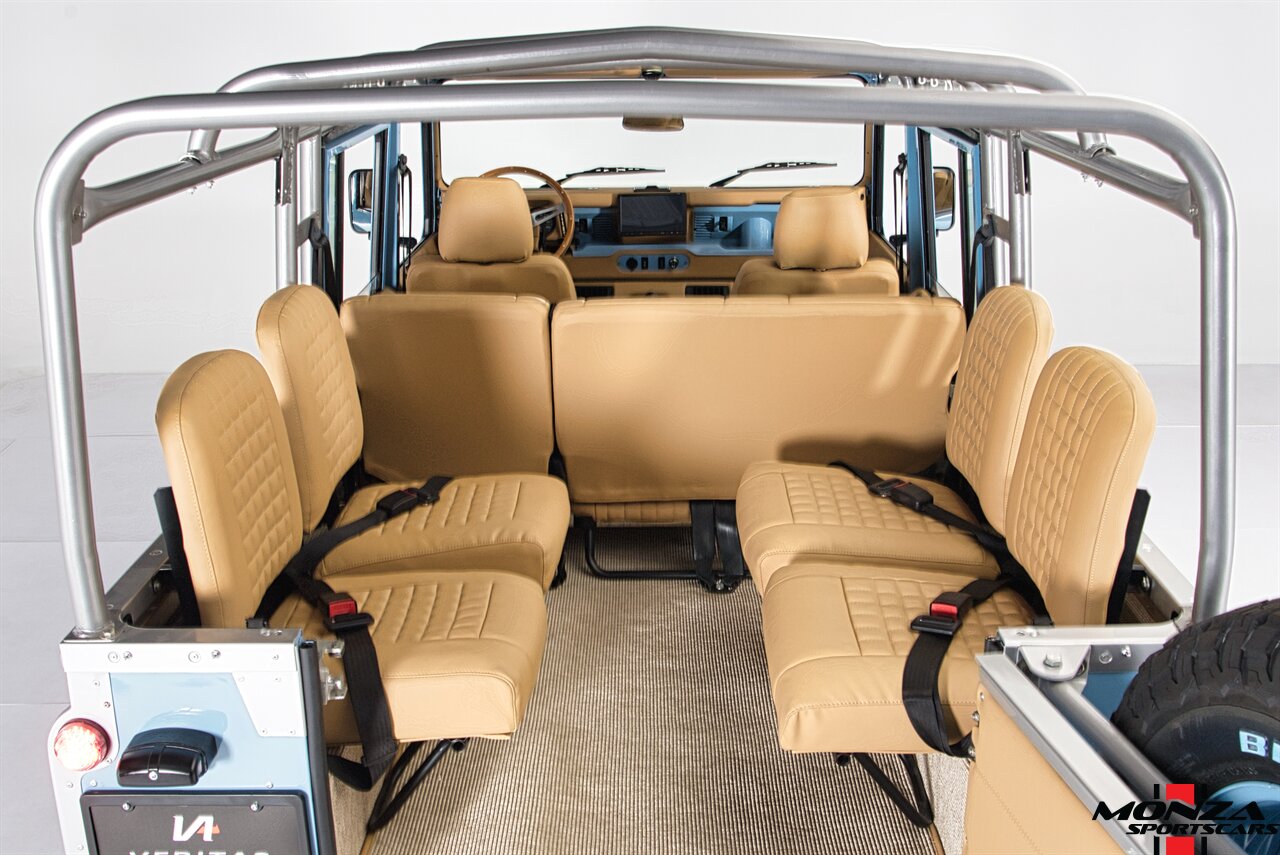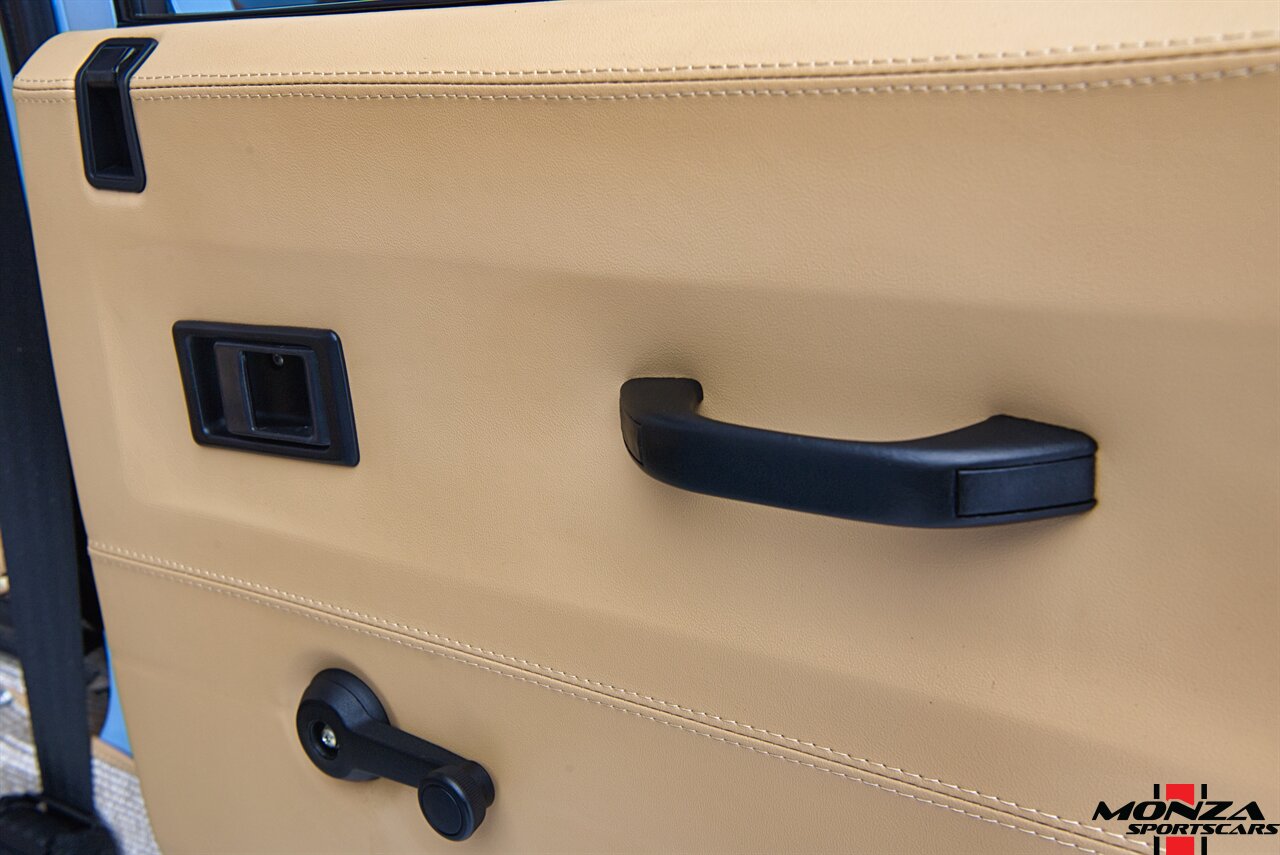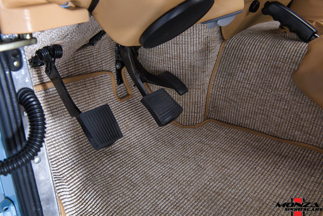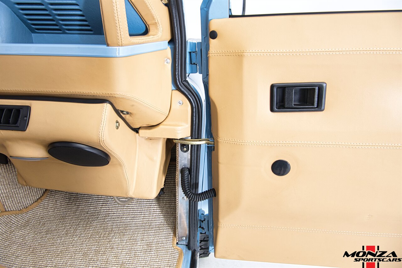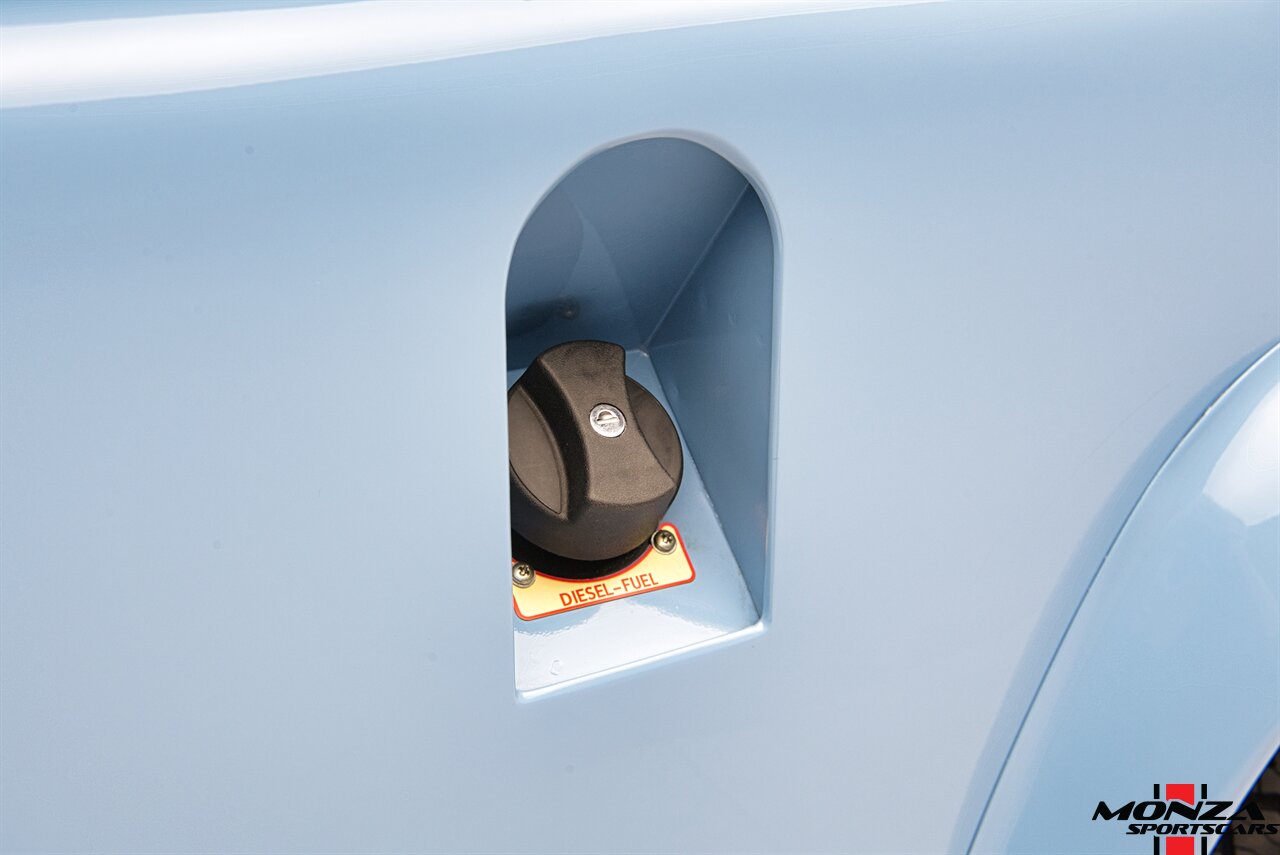 The cabin was overhauled during the refurbishment, and it houses front bucket seats and inward-facing jump seats trimmed in beige upholstery that extends to the dash, center console, and door panels. Interior features include a Pioneer touchscreen head unit, air conditioning, and manual windows. The wood-rimmed steering wheel fronts a 200-km/h speedometer, a clock, and gauges for coolant temperature and fuel level. The digital odometer indicates XXX kilometers (~XXX miles) since this restoration. The true mileage is unknown.