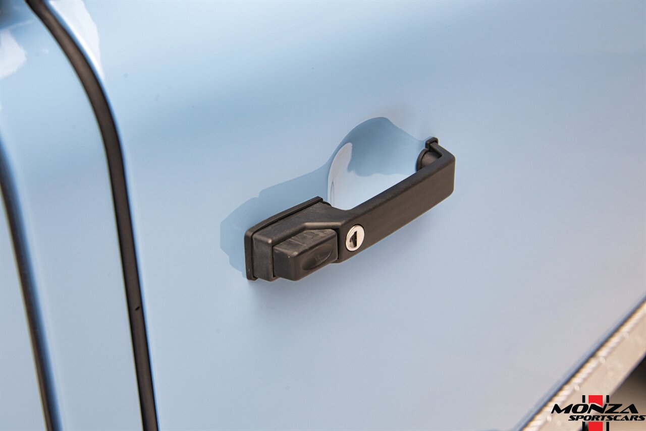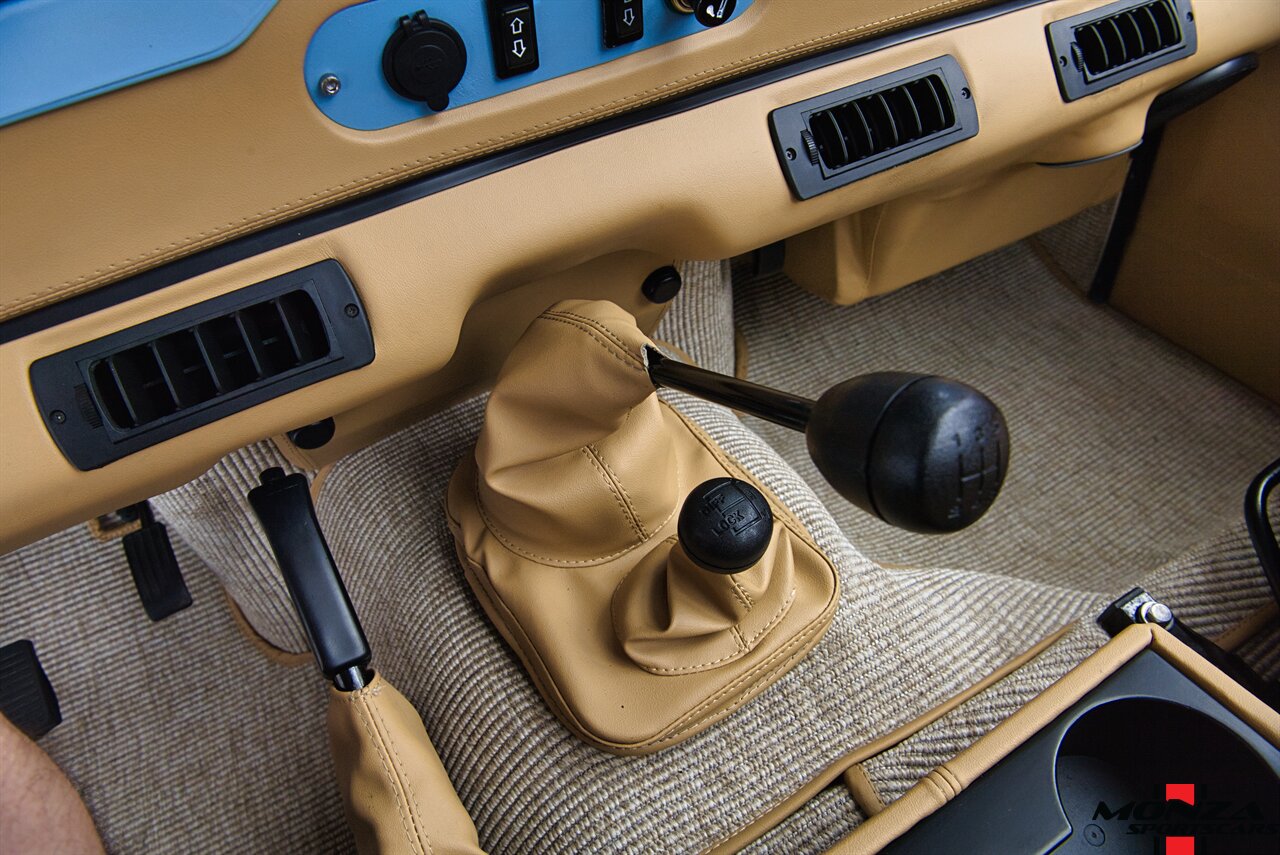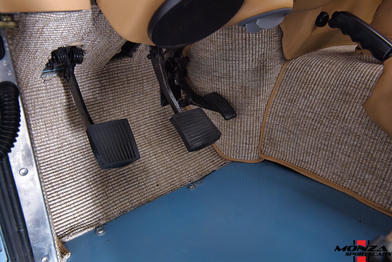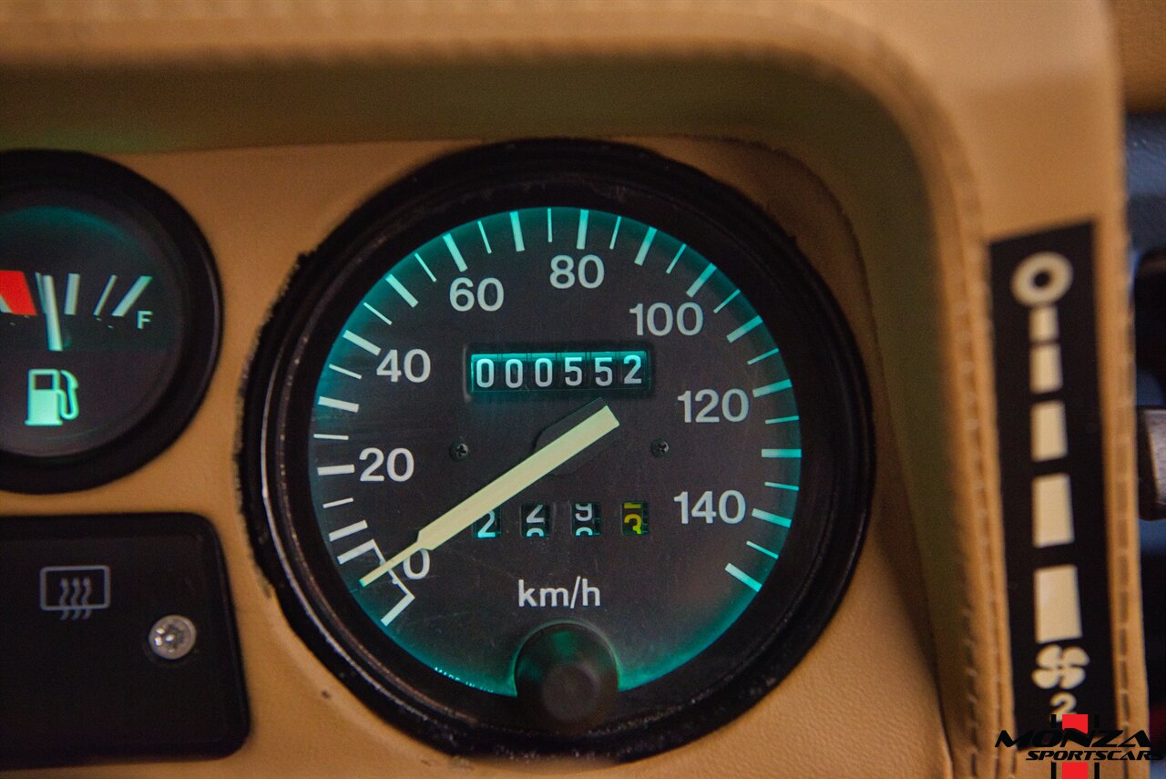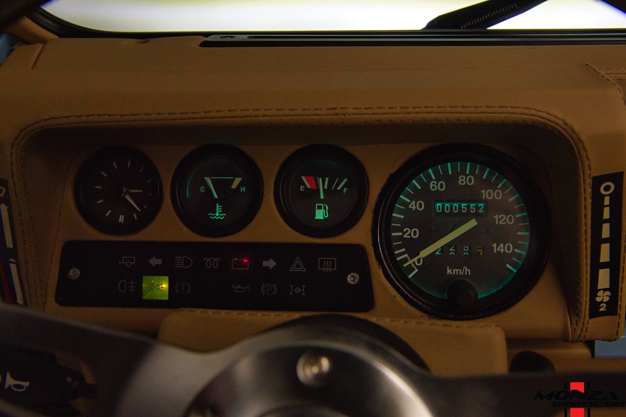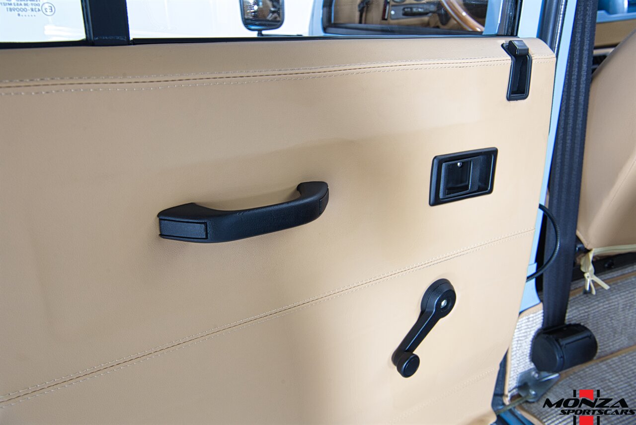 The cabin was overhauled during the refurbishment, and it houses front bucket seats and inward-facing jump seats trimmed in beige upholstery that extends to the dash, center console, and door panels. Interior features include a Pioneer touchscreen head unit, air conditioning, and manual windows. The wood-rimmed steering wheel fronts a 200-km/h speedometer, a clock, and gauges for coolant temperature and fuel level. The digital odometer indicates XXX kilometers (~XXX miles) since this restoration. The true mileage is unknown.