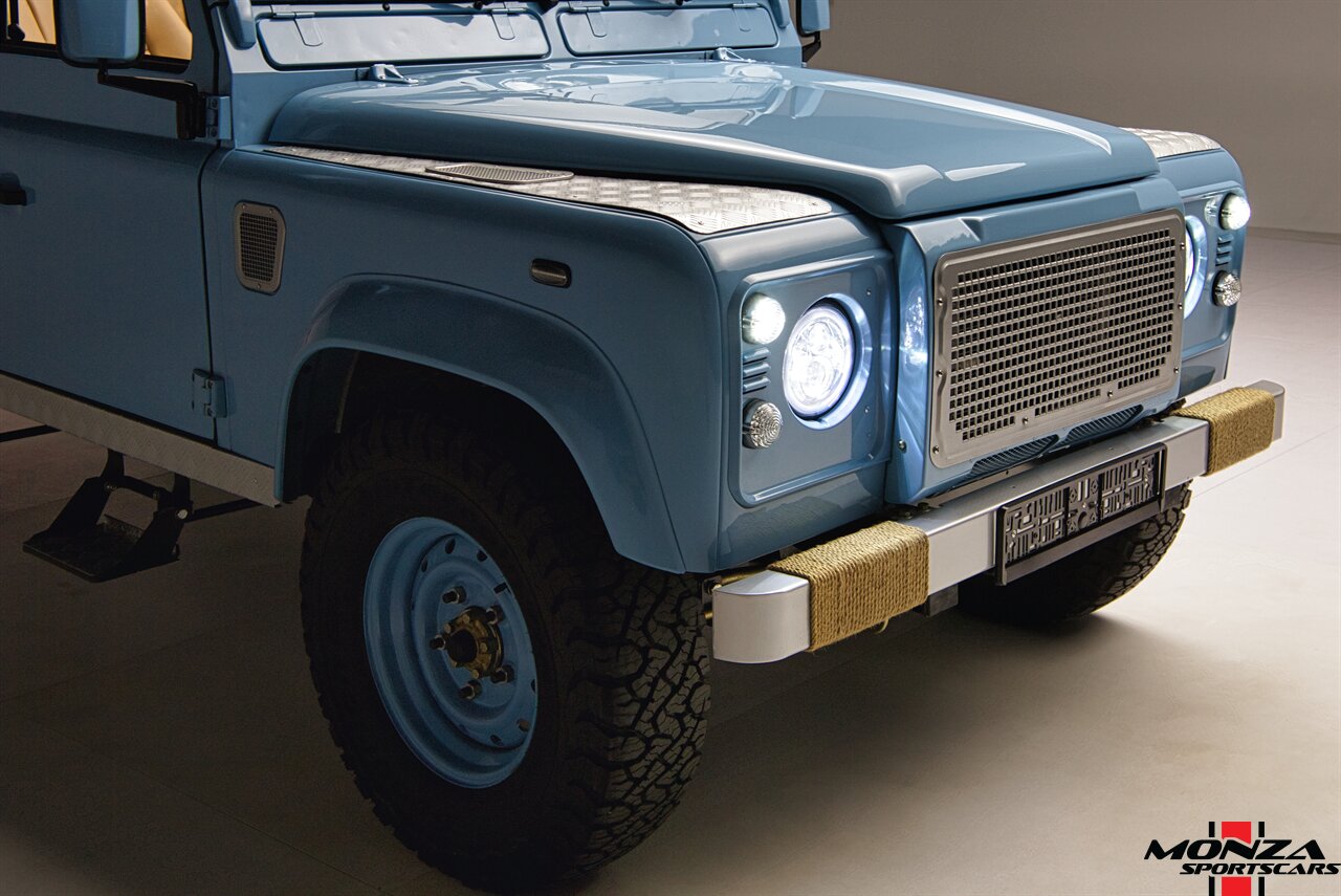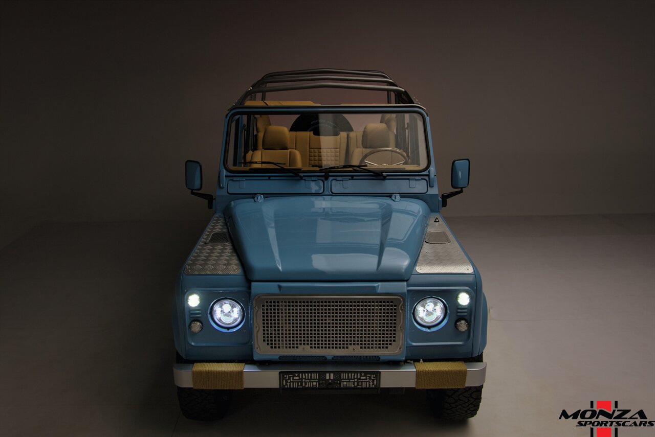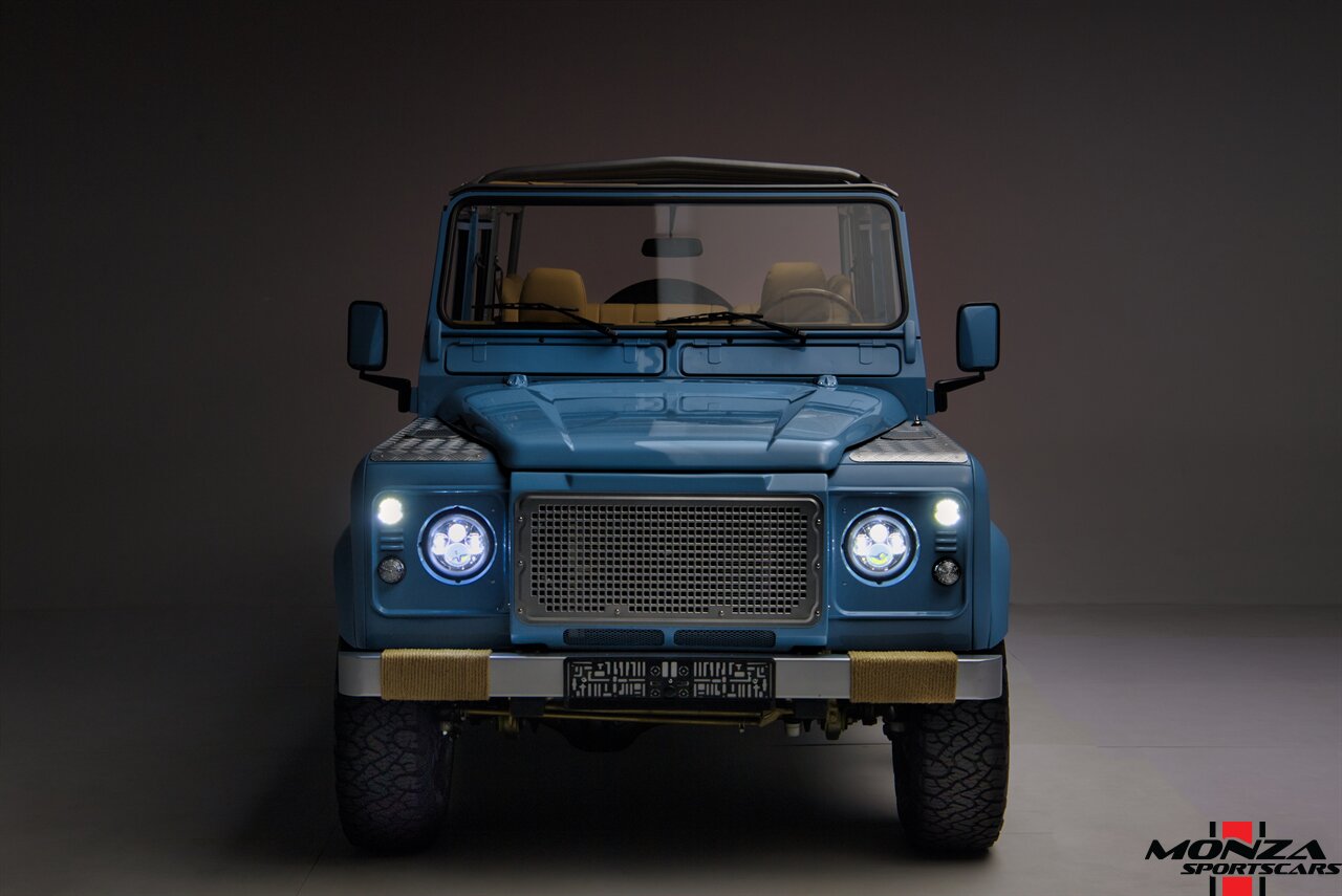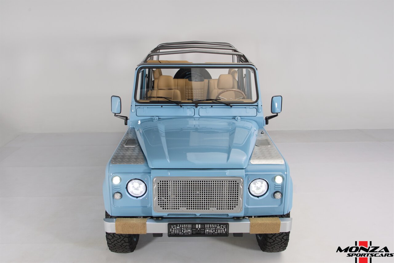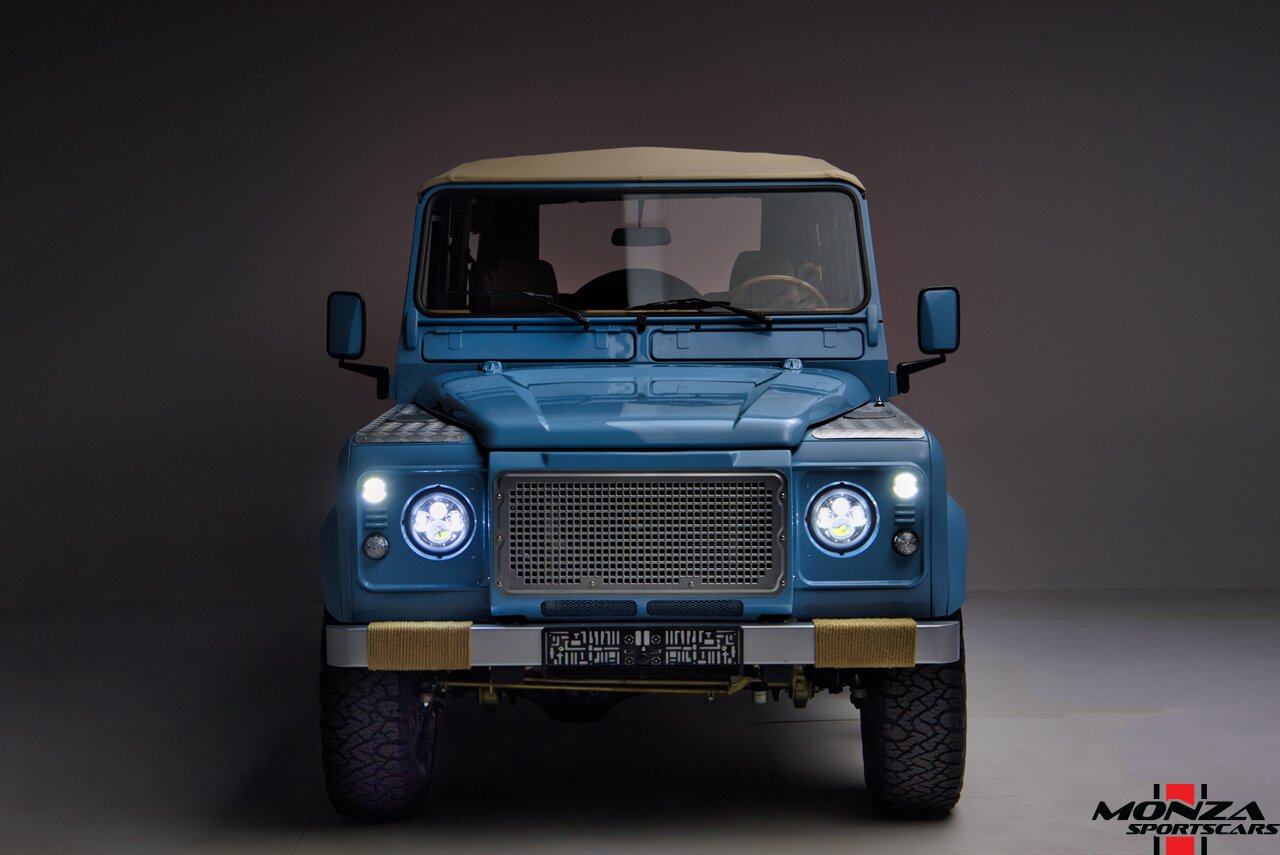 This 1998 Land Rover Defender 110 is a left-hand-drive example that is said to have been refurbished in Morocco before being brought to the US in 2025. It is finished in Light Blue over beige upholstery and is powered by a turbodiesel 2.5-liter 300Tdi inline-four linked with a five-speed manual transmission and a dual-range transfer case. Equipment includes a removable beige soft top, a NAS-style rear bumper, LED lighting, 16? Wolfe Style Steel wheels, painted in body color and four-wheel disc brakes along with a wood-rimmed steering wheel, a Pioneer touchscreen head unit, air conditioning, and inward-facing jump seats. This Defender 110 was acquired in 2025 and is now offered with a clean Carfax report and a Texas title that lists the truck as a 1999 model year.