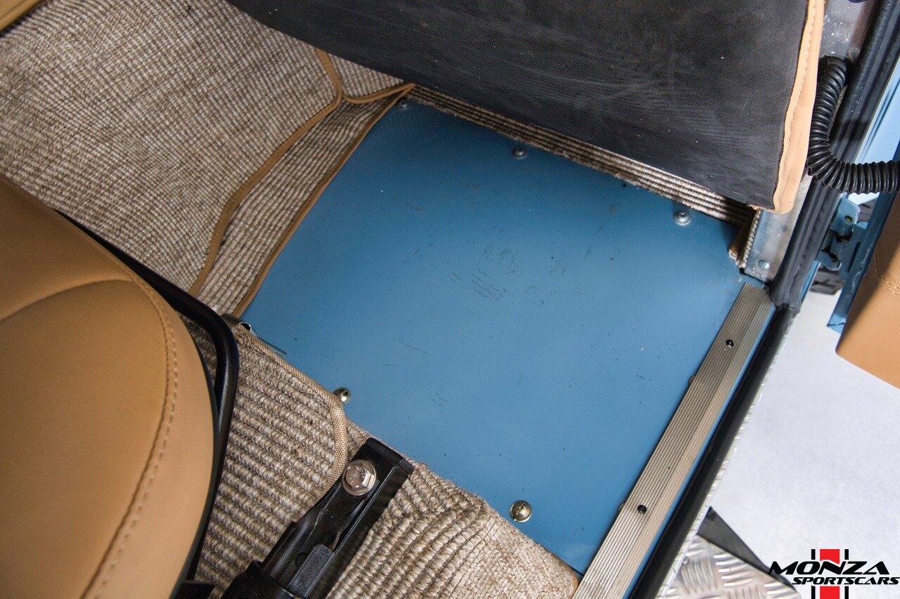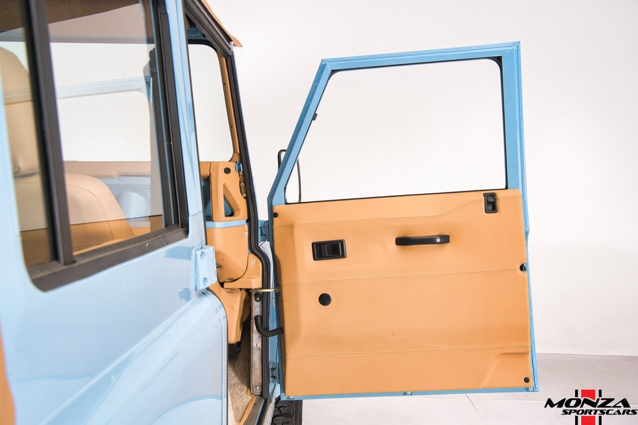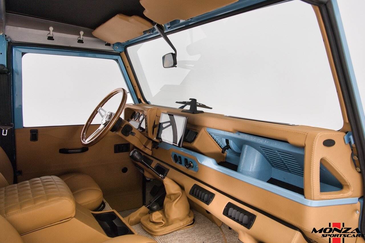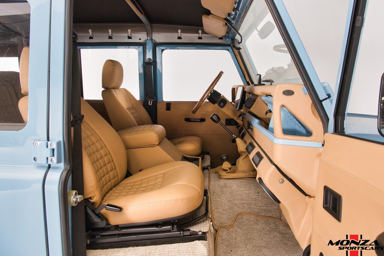 This 1998 Land Rover Defender 110 is a beautifully restored left hand drive example that blends rugged capability with timeless British style. Finished in Light Blue over beige upholstery, it’s powered by a turbodiesel 2.5-liter 300Tdi inline-four paired with a five speed manual transmission and a dual-range transfer case. The exterior features a removable beige soft top with roll-up sides, body color headlight surrounds, side mirrors, and wheel arch flares, all refreshed during its meticulous refurbishment. Additional highlights include LED lighting, a NAS-style rear bumper, fold down side steps, and rear mud flaps for both function and flair. Inside, the cabin has been completely redone with beige upholstery extending across the front bucket seats, inward facing jump seats, dash, and door panels.