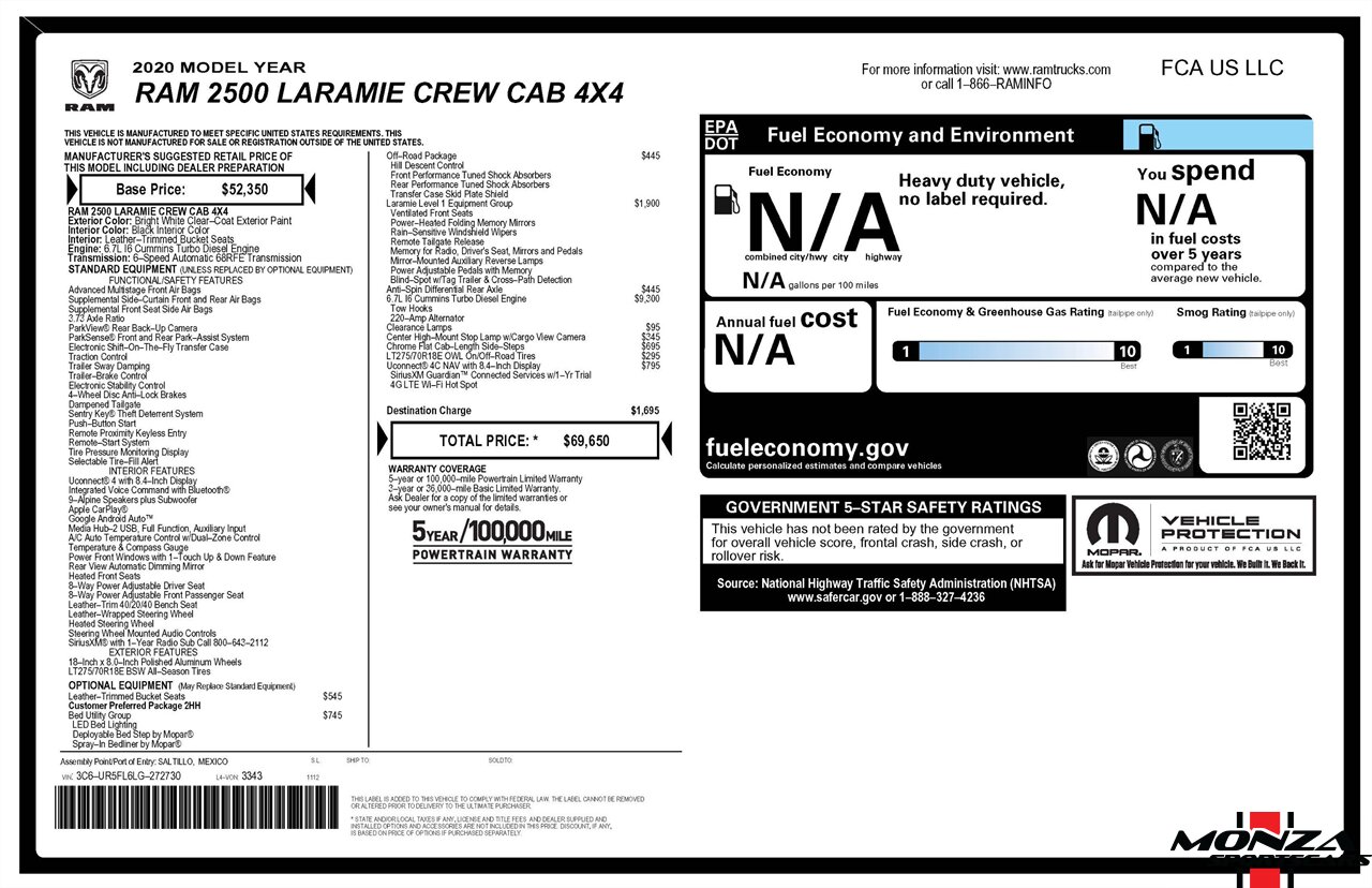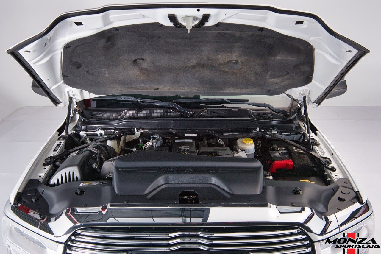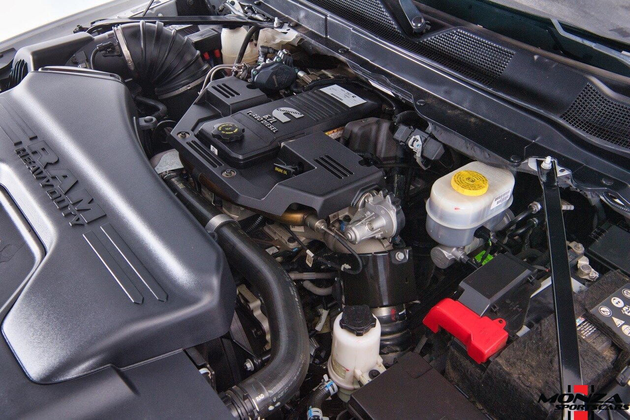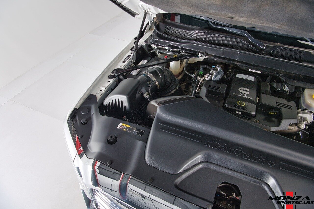 - Quick Order Package 2HHIncludes vehicle with standard equipment, Cummins 6.7L I6 turbo diesel engine rated at 370 hp @ 2800 rpm and 850 ft. lbs. of torque at 1700 rpm, diesel exhaust brake, heavy duty engine cooling, selective catalytic reduction, 220 amp alternator, dual 730 amp batteries, 6-speed automatic transmission, chrome accent shift knob, supplemental heater, RAM active air, front tow hooks, Cummins badge, capless fuel filler, and active noise-control system.